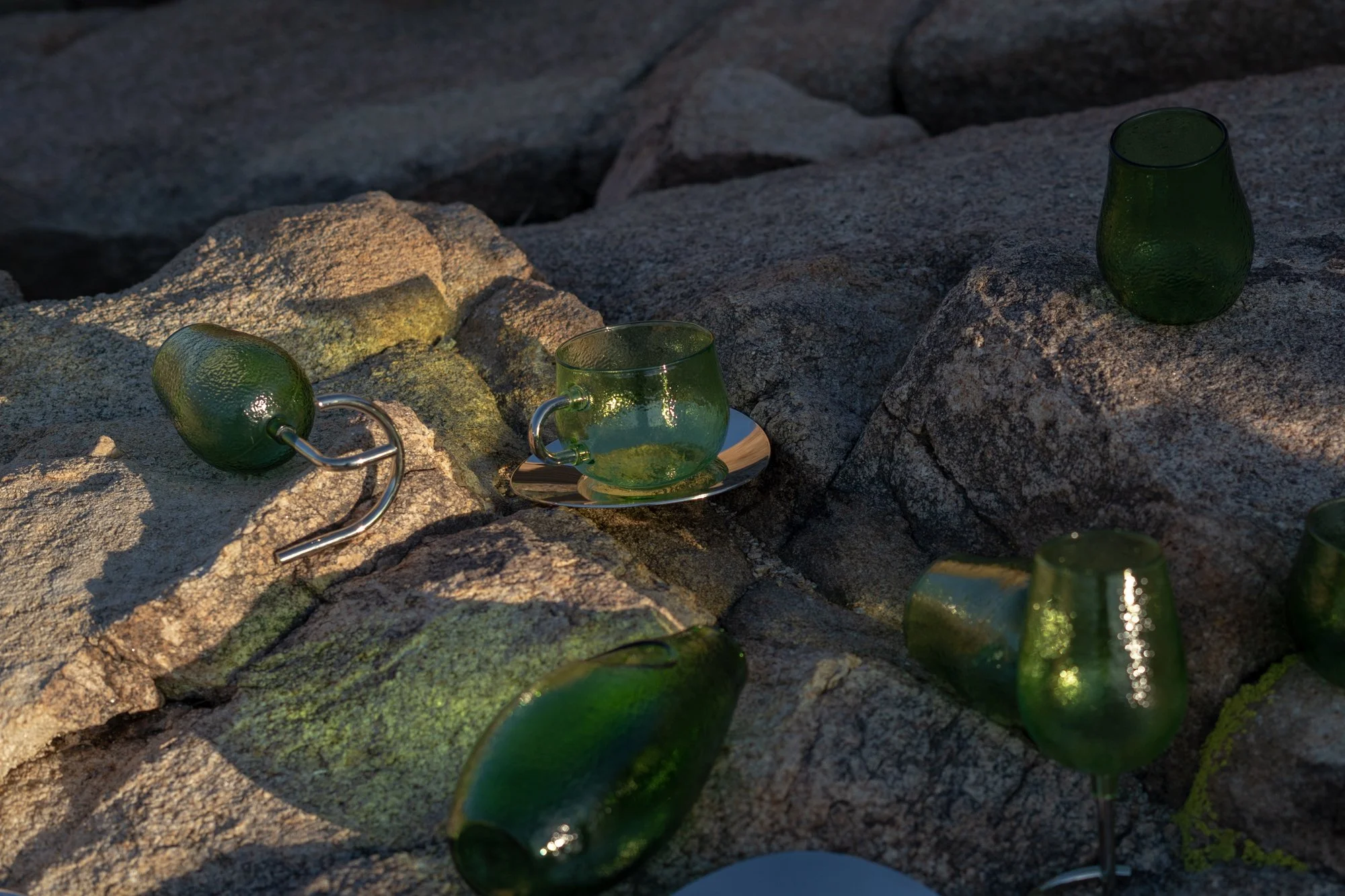The wineglass has a wabi sabi-like texture, with a metallic stem and plate.