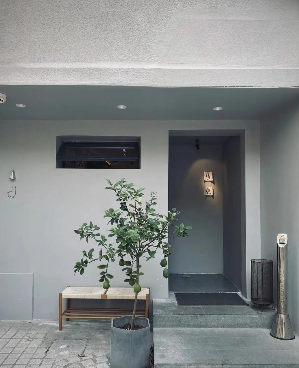 这座和周围板房融为一体的新中式小房子给人最初的印象并不起眼。质朴的水泥灰色外墙, 瓦片上随手写着“ 乌龟 ”两个字的店名, 整体气质简洁干净, 没有一丝多余。进店之前, 看到“乌龟”这个名字, 脑海里瞬间闪过日本的枯山水和花鸟市场的巴西大乌龟。而店内明亮的灯光和干净的室内环境让人眼前一亮,一眼望去的木质边椅和藤编盘子显得清雅而精致,好奇感和舒适感瞬间一同朝我们袭来。