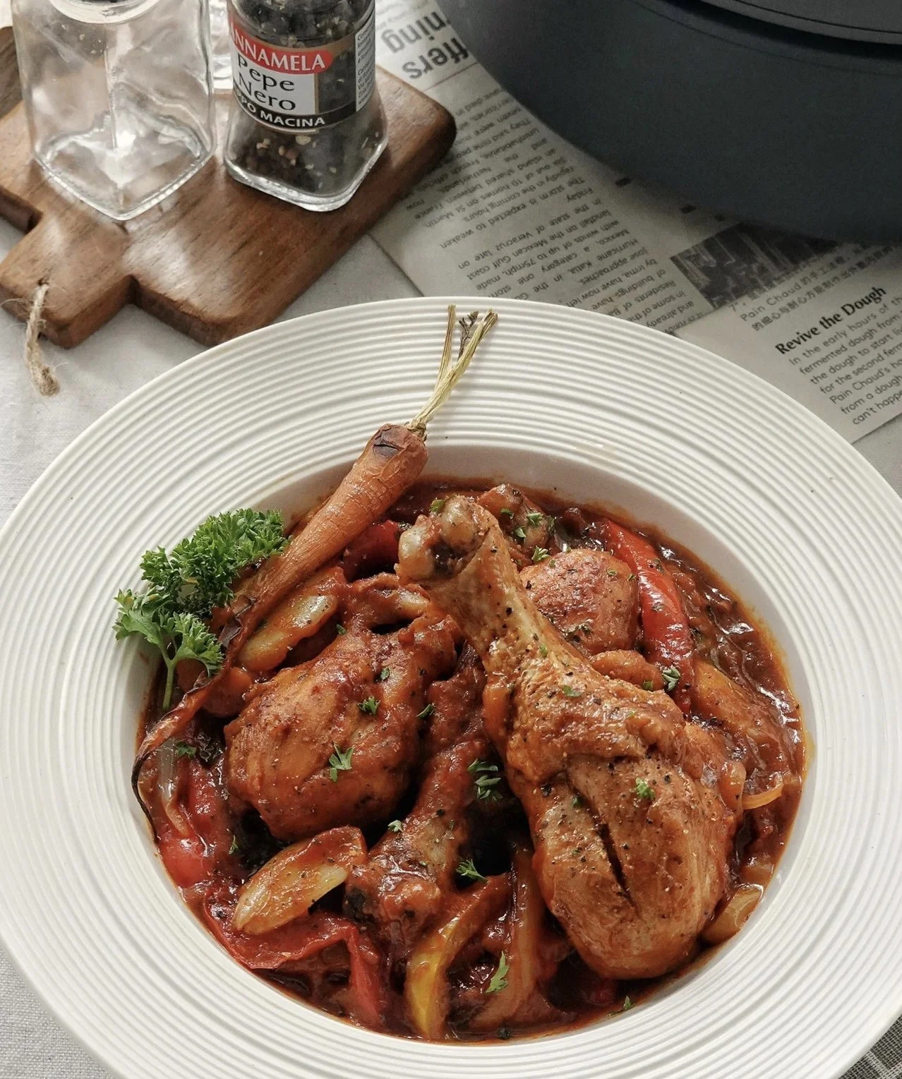 将洋葱放入锅中煮6-8分钟,不断搅拌,直到洋葱变软。加入大蒜煮,经常搅拌,直到洋葱的边缘开始变黄,大约3分钟。加入蜂蜜,番茄酱,姜黄和肉桂,煮约2分钟,直到变香。加入番茄和番茄汁,用木勺把番茄捣碎,直到番茄块不大于1英寸。将鸡肉放回锅中,倒入肉汤(肉汤要刚好盖住鸡肉),然后用小火慢炖。把火调小,盖上锅盖(让蒸汽逸出),慢炖70-80分钟,直到鸡肉变软,汤汁变浓稠。