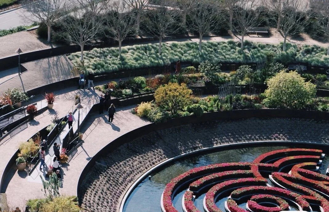 此外,中央公园的设计由艺术家Robert Irwin完成。在花园的南端,设计师随着地形的变化设计了一个圆形的下沉式花园,花园正中有一个以植物组成的几何形图案:由四百棵杜鹃花构成的迷宫。图案周边是被称为“镜池”的水池,从博物馆庭院中引入的一股泉水经过多次转折后汇聚到这里。花园作者称此花园是一件不断被雕琢的艺术品,会随着四季的改变而呈现出不同的变化。